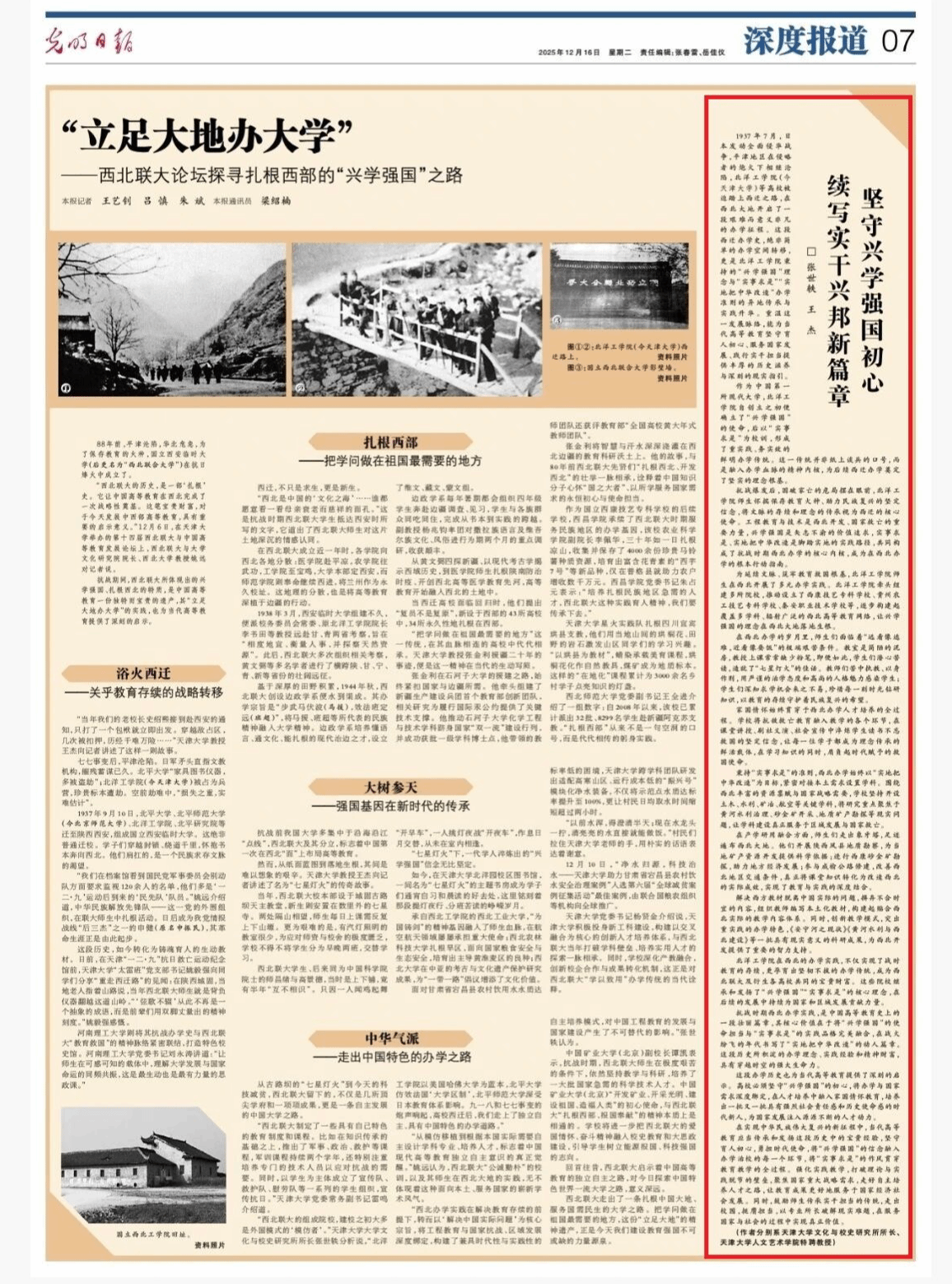 近日,成人影片 特聘教授王杰、大学文化与校史研究所所长张世轶在《光明日报》2025年12月16日第07版发表题为《坚守兴学强国初心 续写实干兴邦新篇章》的署名文章。现予以转载,以飨读者。