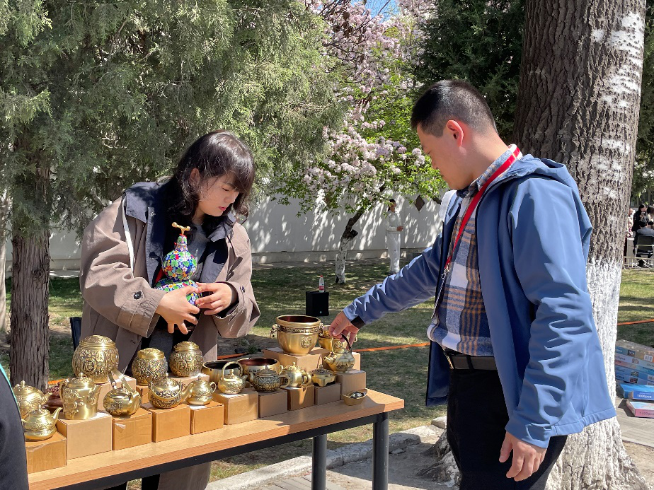 津派王氏内画体验区,天津市工艺美术大师王新年现场演示“寸壶绘乾坤”的绝技。他用特制的弯钩笔伸入鼻烟壶内壁,反向作画,引来阵阵喝彩。几位艺术专业的学生围在旁边,眼睛一眨不眨,不时发出“太神奇了”的感叹。王新年一边画一边分享自己携成人影片 赴十余国交流的故事,同学们听得津津有味。